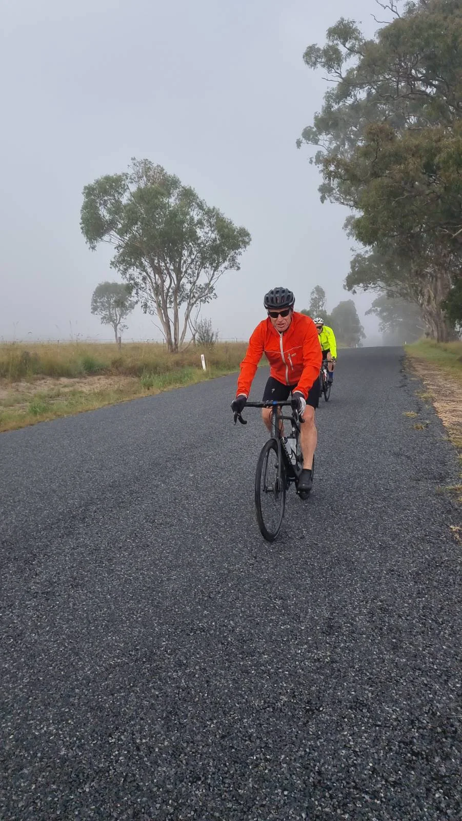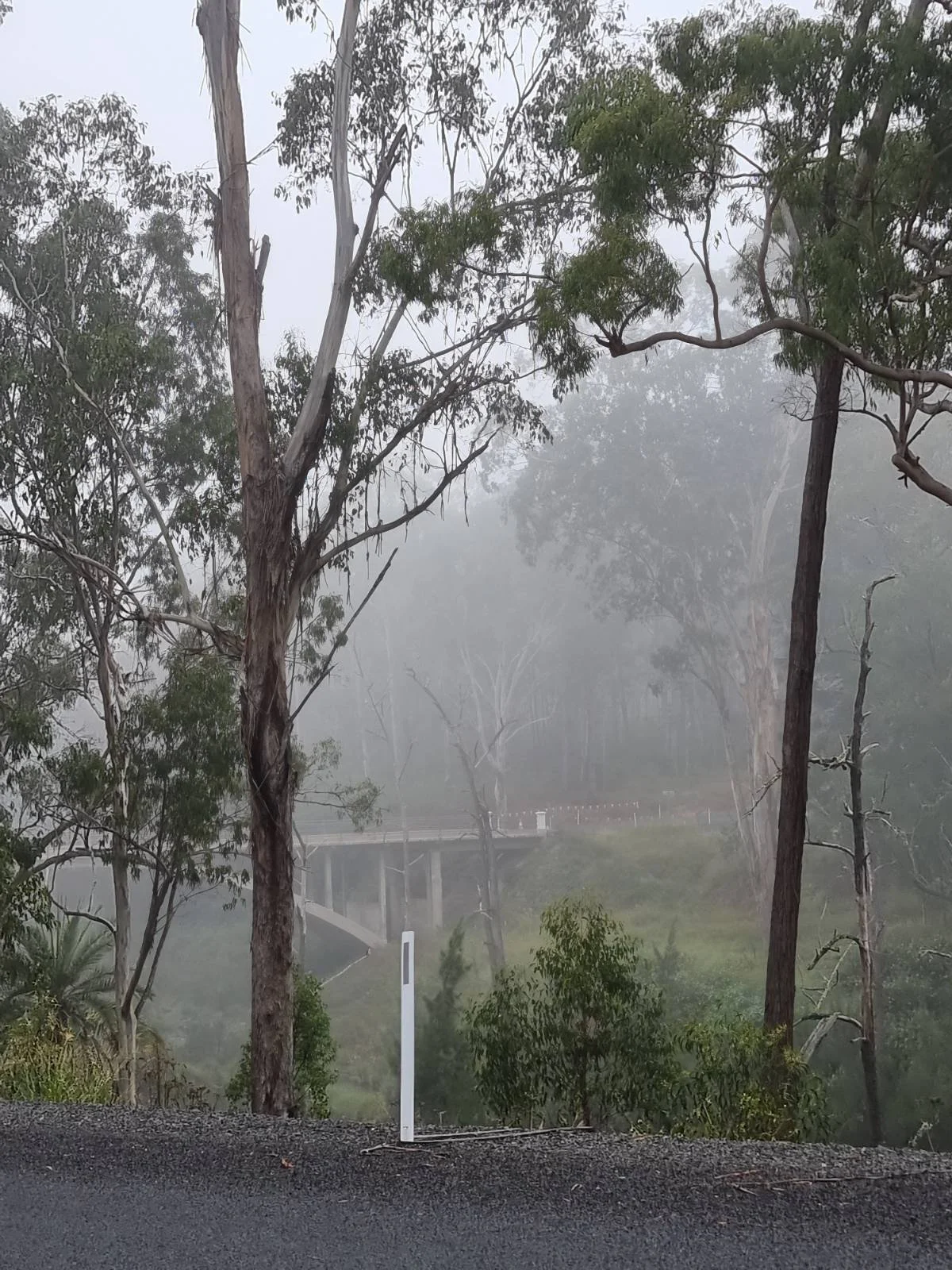 We started where Sam finished last evening about 35k north of Stanhope, so a short drive before we clipped in for the exciting day. The ride took us ever up (what is it with all these hills) but then came some glorious descending winding down from the ridges into a river gorge. Luckily we had taken our jackets as it was freezing cold in the mist. At one exciting point Sam disappeared into the mist and out came a longie, on the other side of the road of course, but nevertheless nerve racking as the vehicle just popped out of nowhere.