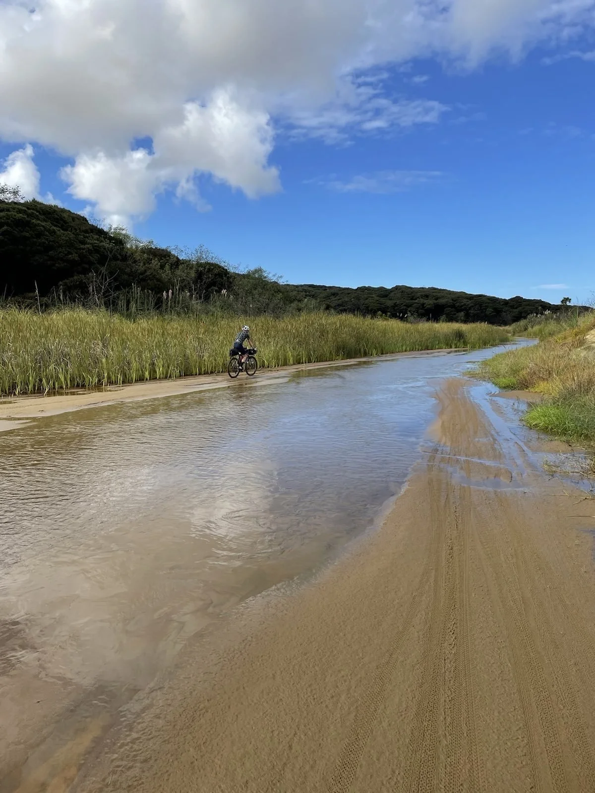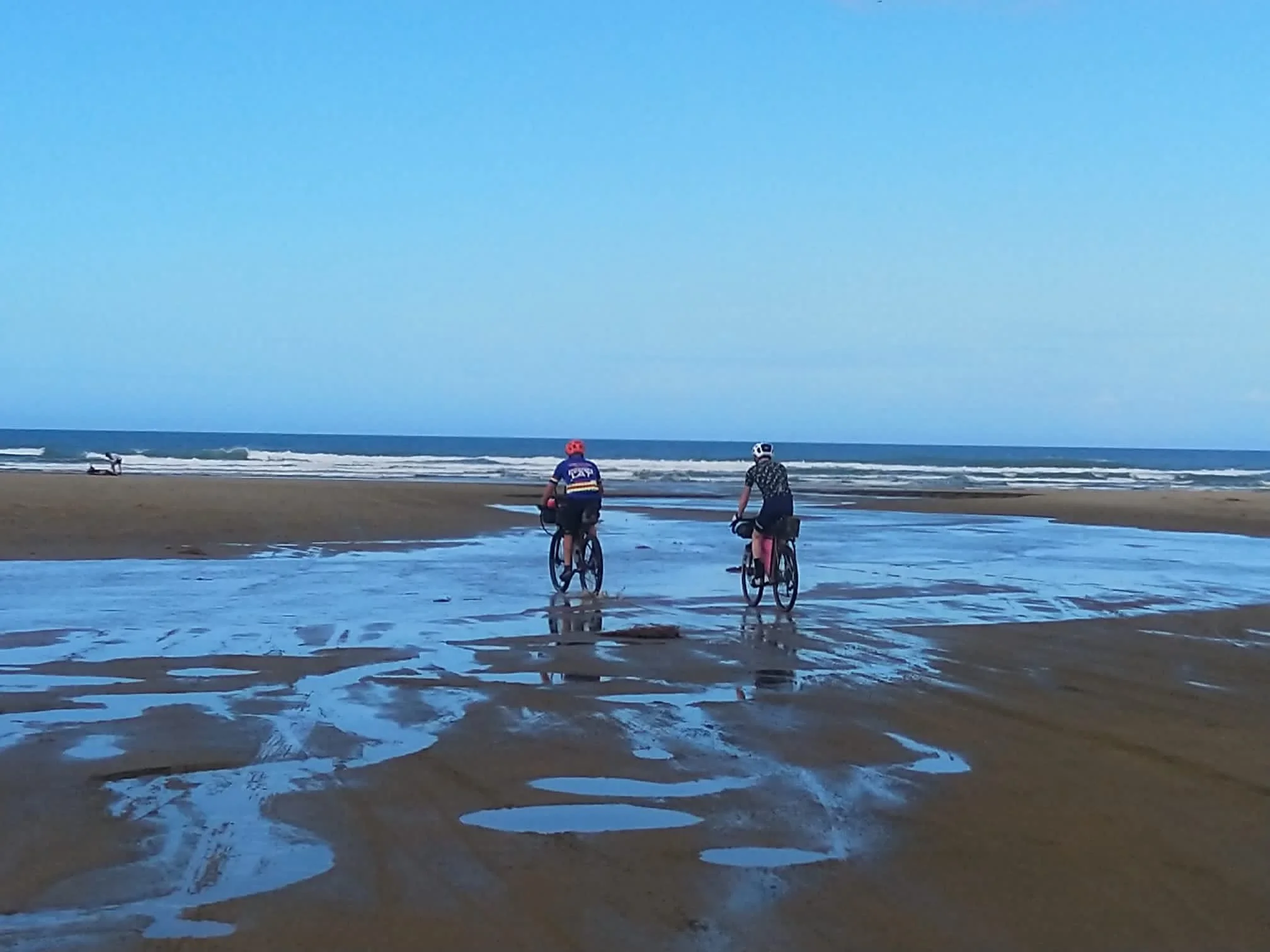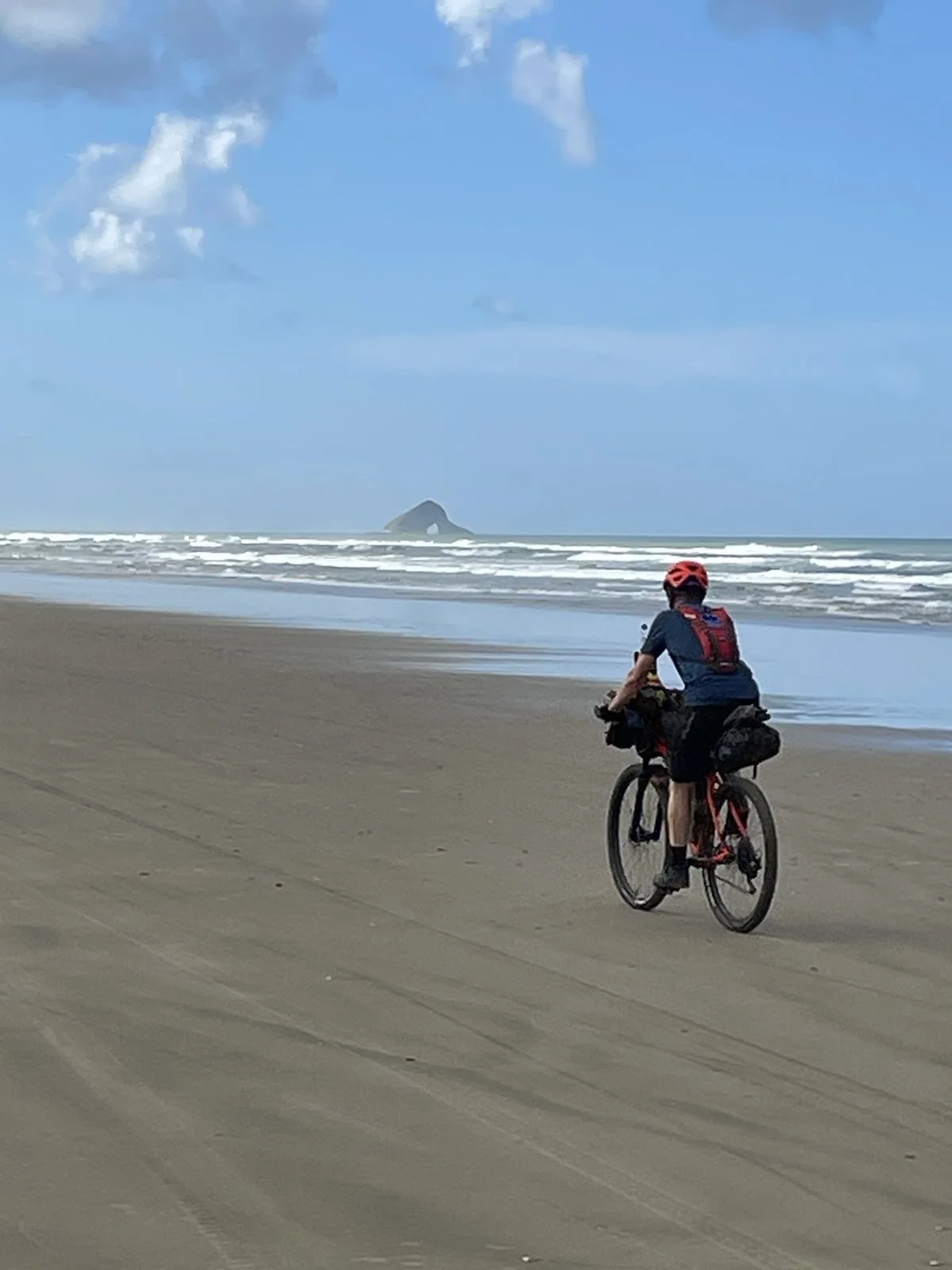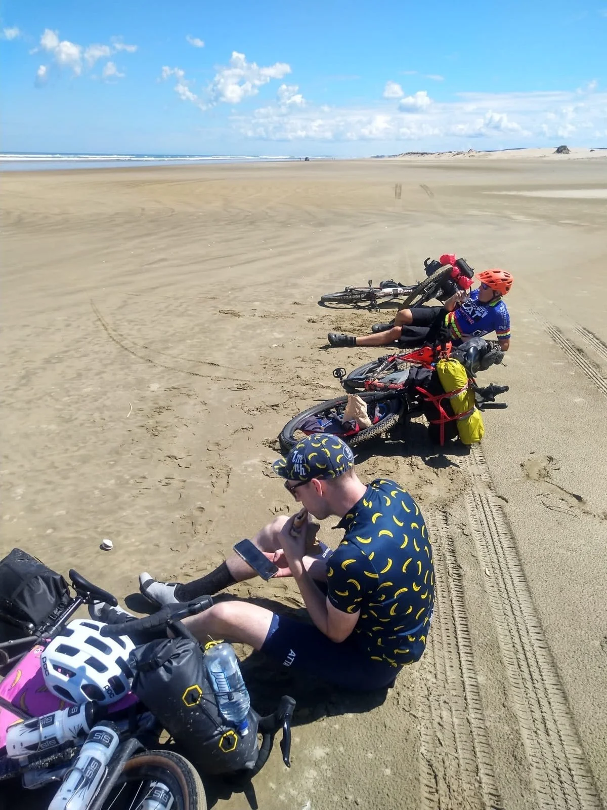 Team We’re Bluffin’! off to a flying start which was soon given a reality check upon hitting the beach. Ahead was an 84k expanse of flat but gruelling sand which coated our bikes and the drive train making for heavy going. Lesson of today was “take more food!” Unfortunately we relied on the shuttle service from yesterday to provide the lunch, but there’s lunch for kids and food for mental cyclists! Plenty of photo opportunities as you can see. 7 hours after the grand depart we arrived in Ahipara campsite. Now for dinner 🥘 and an early night. Thanks go to Phil who we met on the beach who gave us water and a banana.