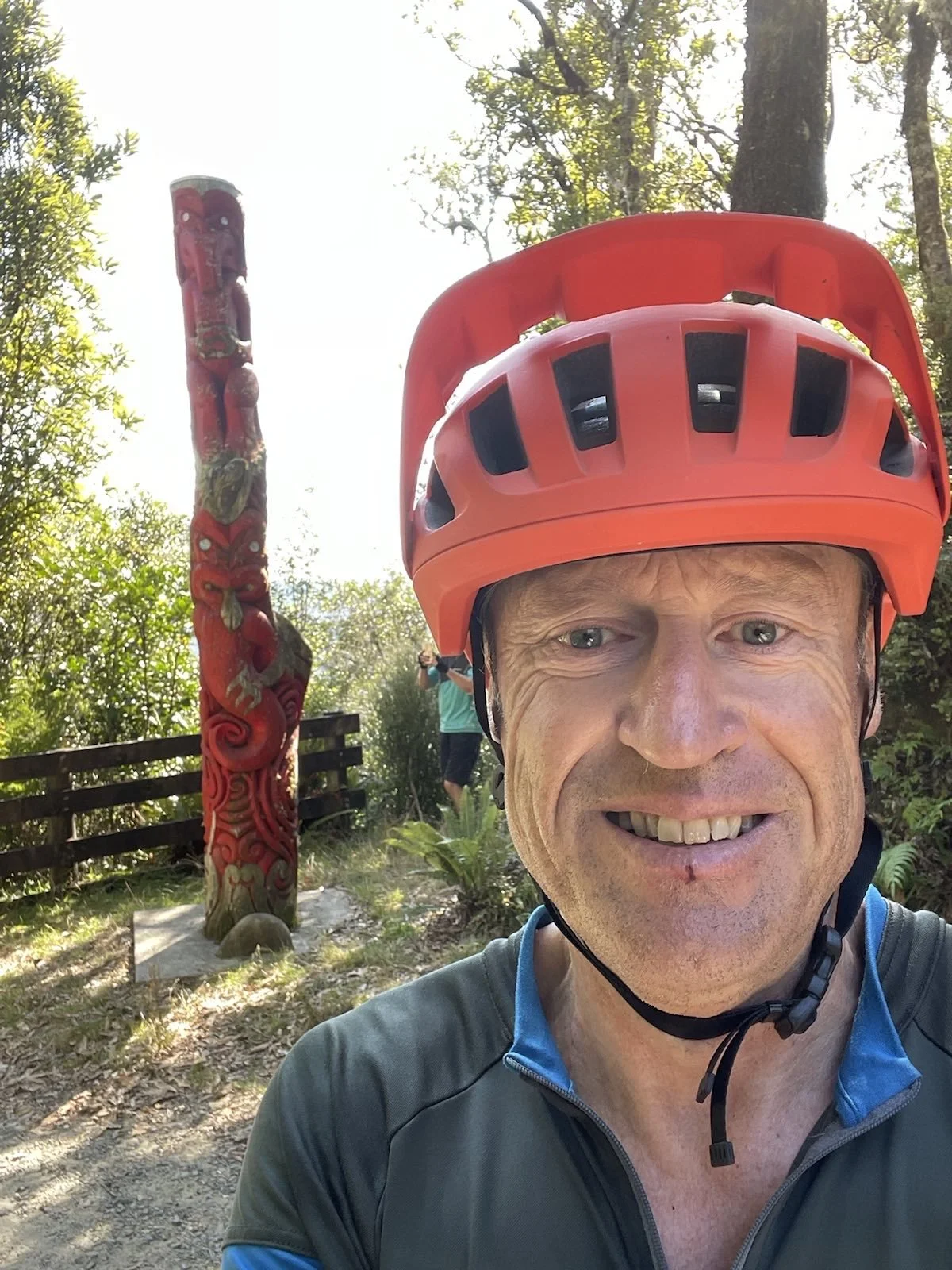 On the trail just before 8, aiming for 4pm jetboat down the Wanganui river from Mangapurua Landing to Pipiriki, and having been advised the ride could be 7hrs. Initial pleasant climbing soon gave way to over 10km of challenging single-track on the Kaiwhakauka track - great relief when that became 4WD track and much easier (though steeper!) Eventually summited at Mangapurua trig - spectacular views all round, with Mt Taranaki looming in the heat haze. Then rich reward with loooong downhill, gradually levelling out to beautiful single-track - so good that Alastair got distracted and nearly faceplanted a fallen tree across the track! - all the way to Bridge to Nowhere, and jetboat waiting just 2km further on - the 1pm one! Hugely enjoyable blast down the river for 40mins, and arrived at Wanganui River Adventures HQ for pre-ordered lunch. Andy decided to go on to Wanganui (only another 70-odd km!) to get his bike to hospital for drivetrain repairs, where Alastair will join him tomorrow (as he'd had enough for today!)