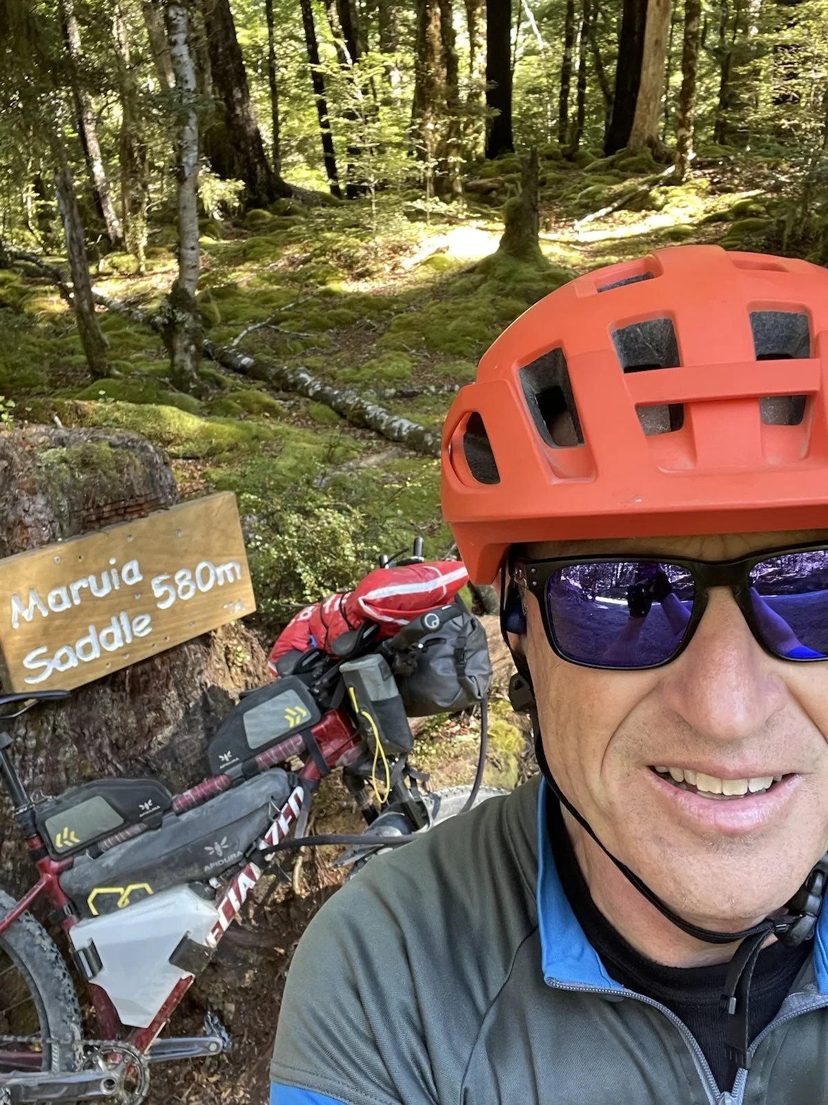 Another lovely most clear blue sky day albeit a little chilly and misty first thing. Breakfast at the Commercial Hotel Cafe was full on English for some with standard B&E for me plus usual wake us up coffee. On the road out of Murchison just after 8 am with a long sometimes bumpy ride into the valley and foothills heading towards the Maruia Saddle road. The ride up to the saddle started off very steep but soon reduced to moderately steep for 20k and a ride of 580m. See photos of us and others riders at the top.